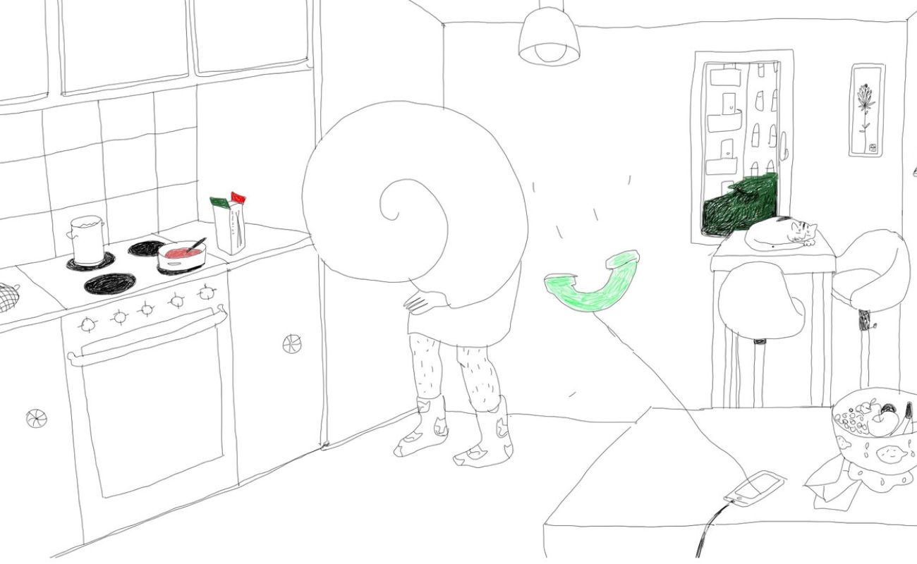 Ein Schneckenkörper auf Stiefeln bewegt sich durch das Alltagsleben – von der Büroarbeit zur Party. Doch gerade dort zu funktionieren, wo die Erwartungen mit am Tisch sitzen, wird zur Hürde, die im Schneckenhaus endet. Abschottung und Autonomie entwickeln sich in dieser Animation mit klarem schwarzen Strich zu einer Reise in neue Möglichkeiten. (filmkorte.de)